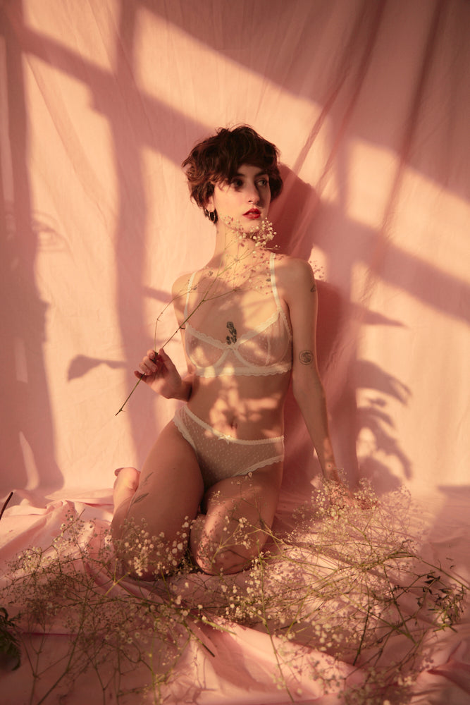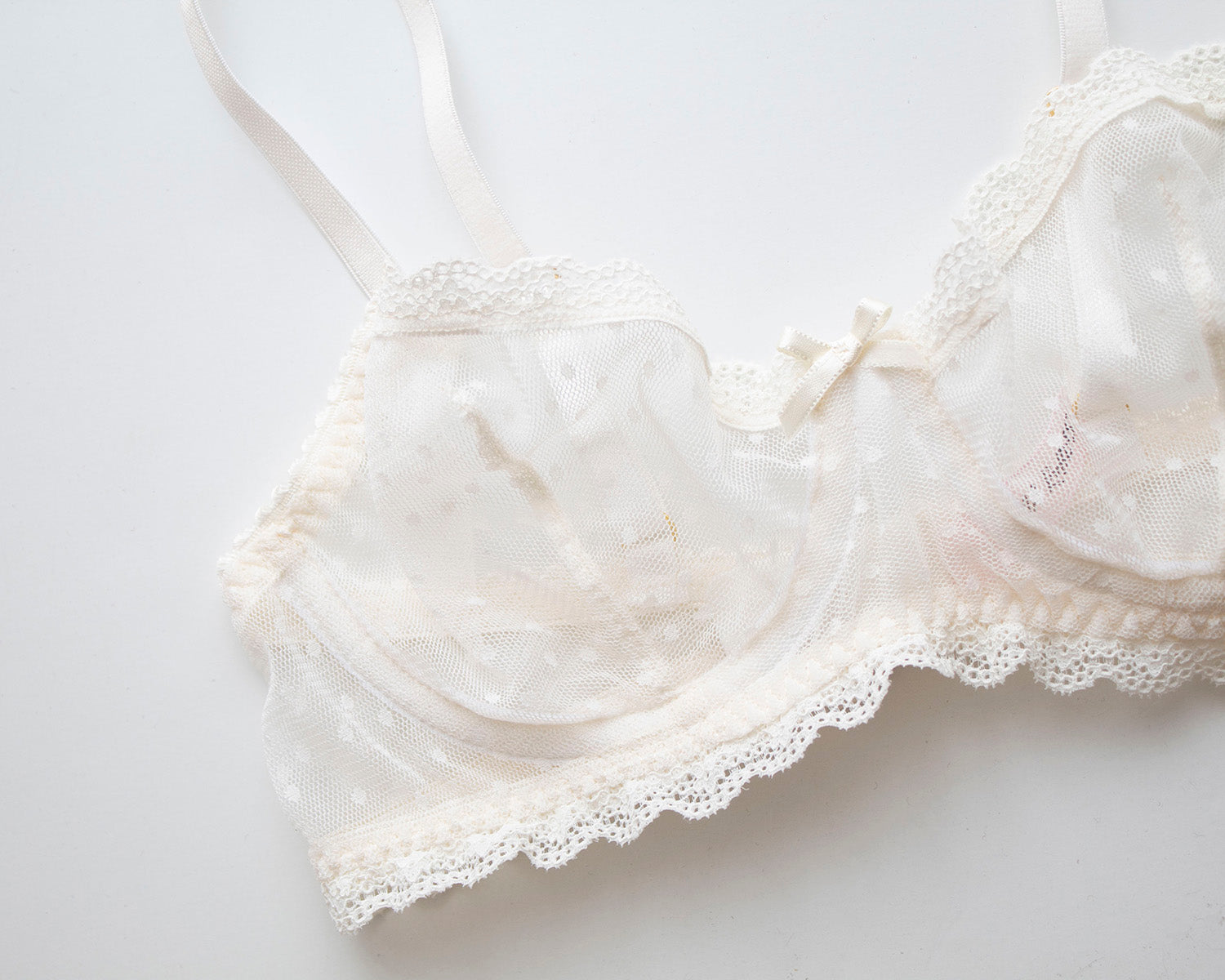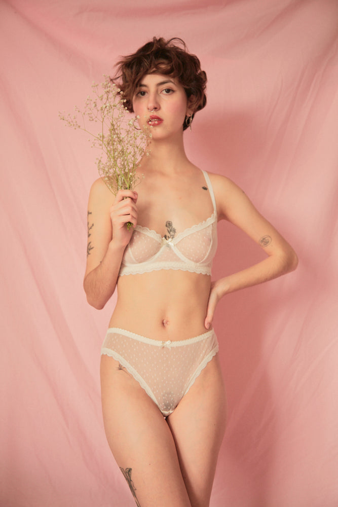 Bra de varilla confeccionado en suave tul de puntos color hueso. Elástico para lencería y orilla de encaje floreado mini en el escote y en la base. Tirantes ajustables con aros y tensores en forma de corazón de metal bañados en color oro. Moño satinado en el centro y broche ajustable en la espalda.