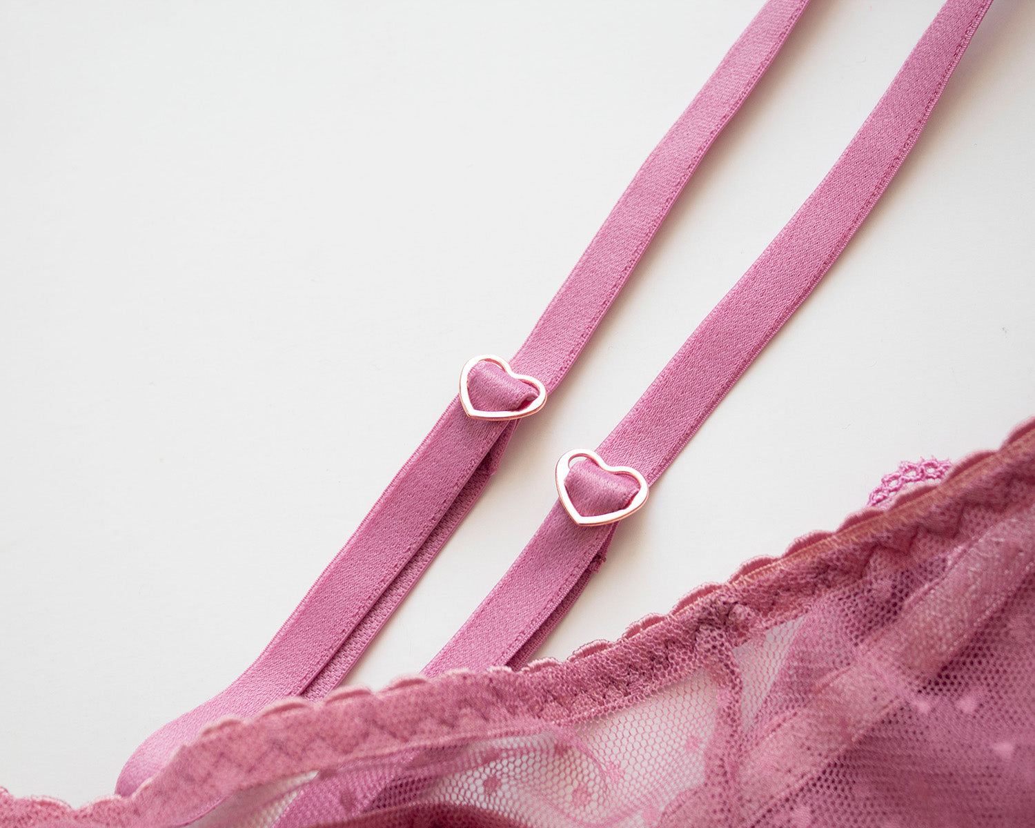 Bra de varilla confeccionado en suave tul de puntos color rosa. Elástico para lencería y orilla de encaje floreado mini en el escote y en la base. Tirantes ajustables con aros y tensores en forma de corazón de metal bañados en color oro rosa. Moño satinado en el centro y broche ajustable en la espalda.