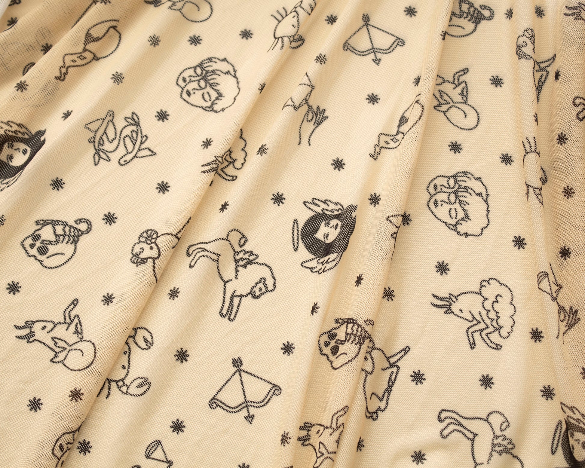 Top bralette confeccionado en suave tela mesh estampada con ilustraciones de los 12 signos zodiacales en color negro sobre un fondo suave que se funde con la piel. Contorneado con suave bies elástico color negro. Tirantes ajustables con aros y tensores metálicos bañados en negro.